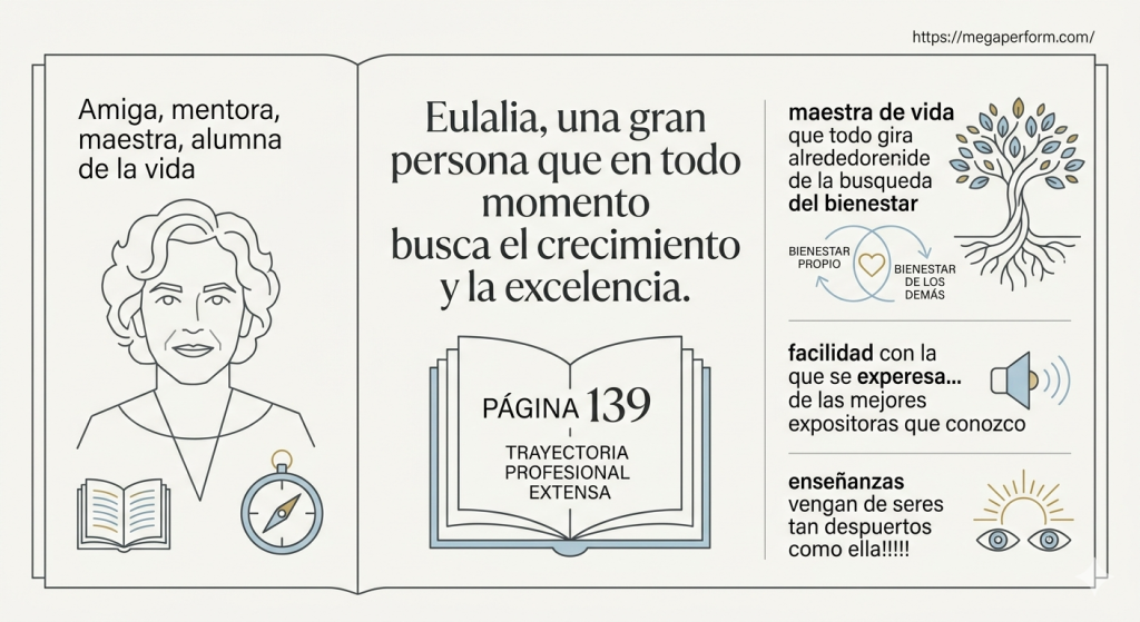 Menciono la página 139 porque es la página que viene descrita su trayectorias profesional la cual es muy extensa, pero además de ello en lo personal la Dra. Eulalia es una maestra de vida que todo gira alrededore de la busqueda del bienestar para ella y para los demás.